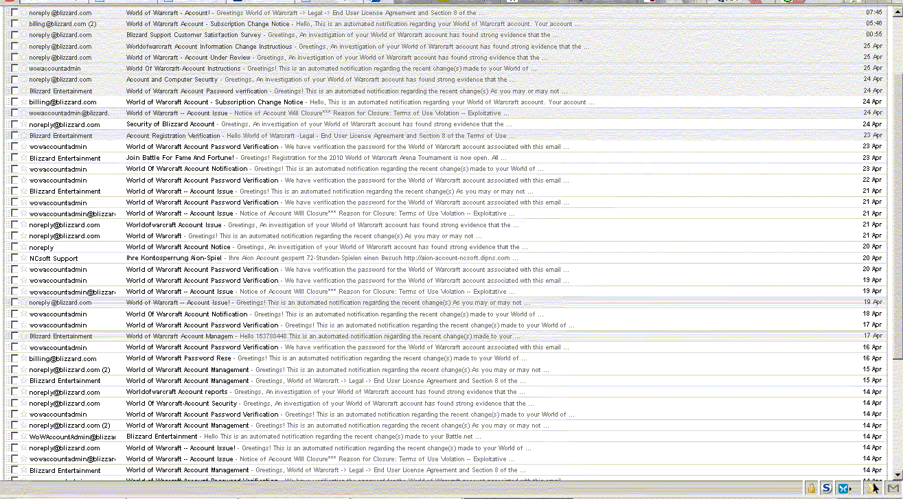 | 11:47 - Hacker spam I don't normally check my spam folder on Gmail very often. I was amused at how many hacker-scam-attempts I had though, especially considering that my WoW account isn't on Google Mail ;) Moused over a few of the links (from work) to see the god-awful fake links, and then thanked the lord I have an authenticator. Also amused to see one which appears to be for Aion, which I've never ever played! :P